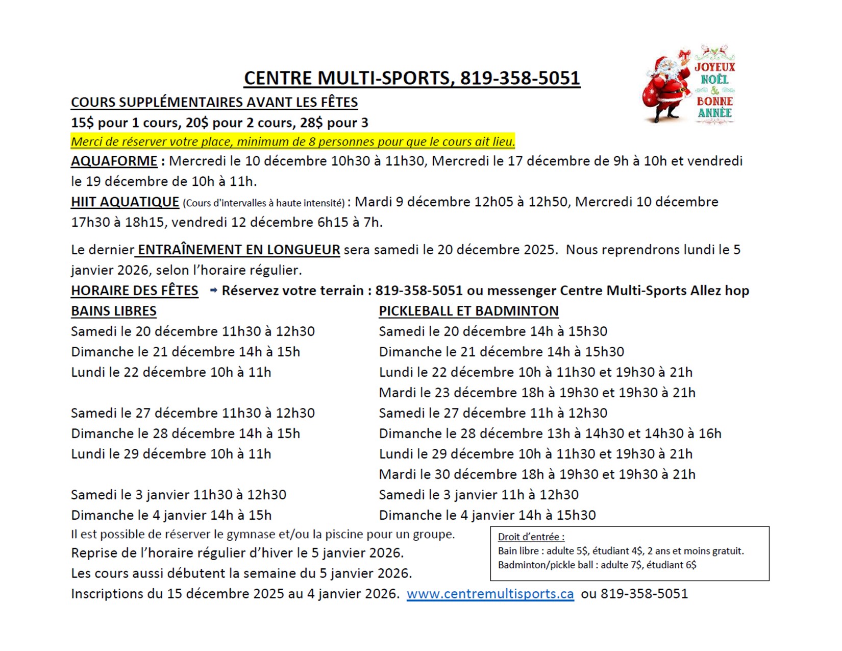 Pour la tarification et l’horaire des fêtes, cliquez sur le lien suivant : https://bit.ly/4pocJfj.