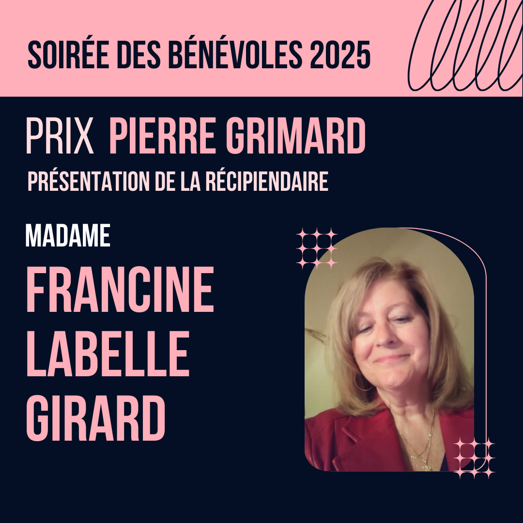 C'est avec fierté que la Ville de Danville décerne le Prix Pierre Grimard 2025 à Francine Labelle-Girard, femme d'affaires et bénévole d'exception qui enrichit notre communauté depuis plus de 30 ans.